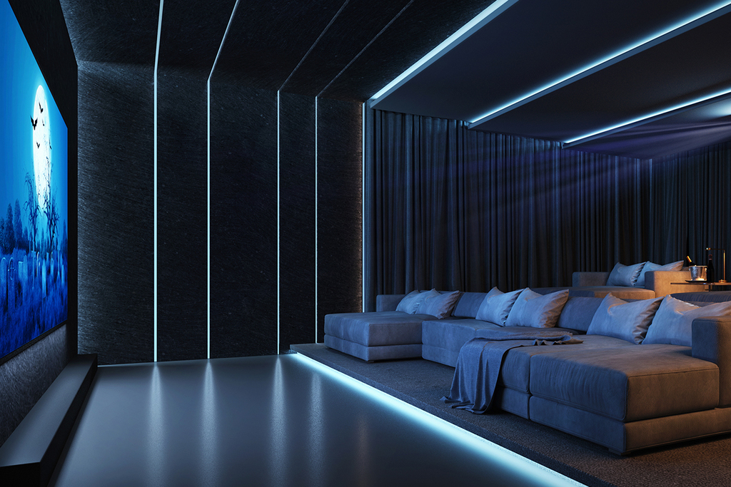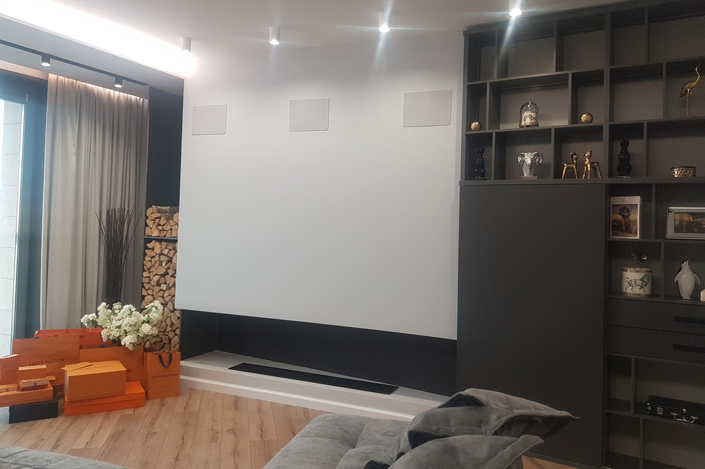 Para las salas de cine privadas utilizamos cajas acústicas robustas y macizas con un grosor de pared superior a 18 mm (según el modelo de altavoces empotrados) y con una capa polimérica especializada.